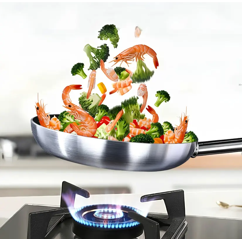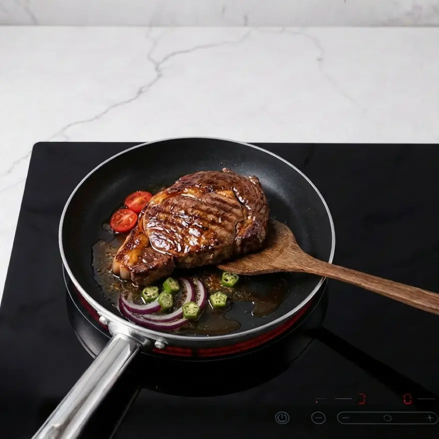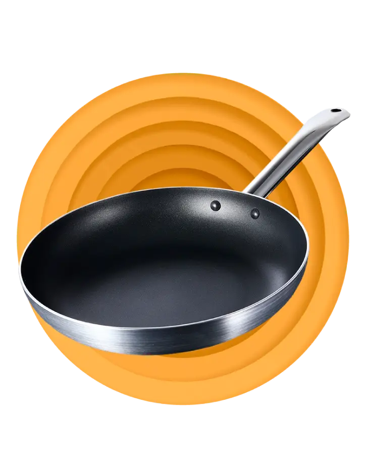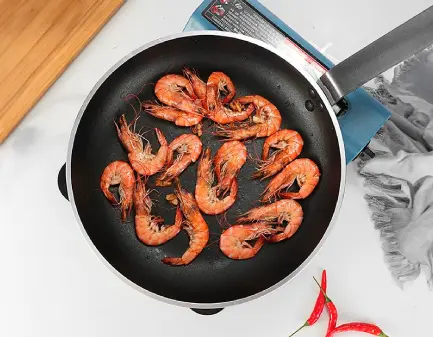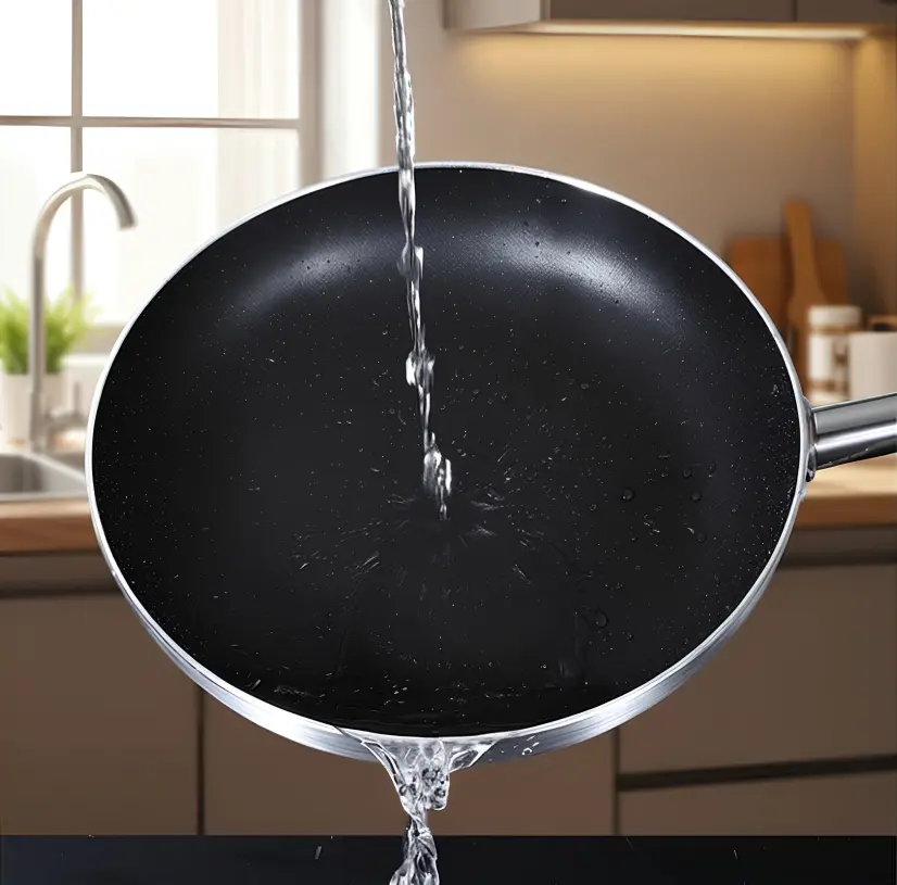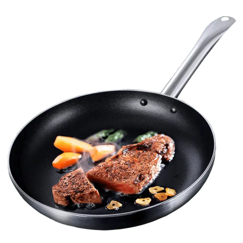The frying pan has a non-stick coating made with PEEK, a safe material free from PFOA, cadmium, and lead, ensuring that food doesn't stick to the surface.