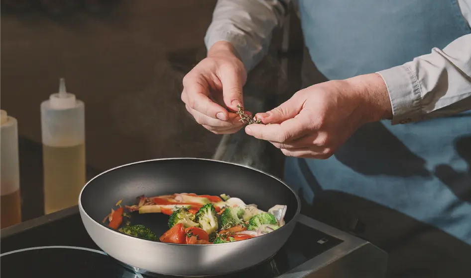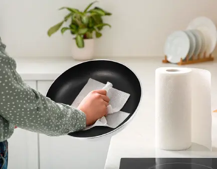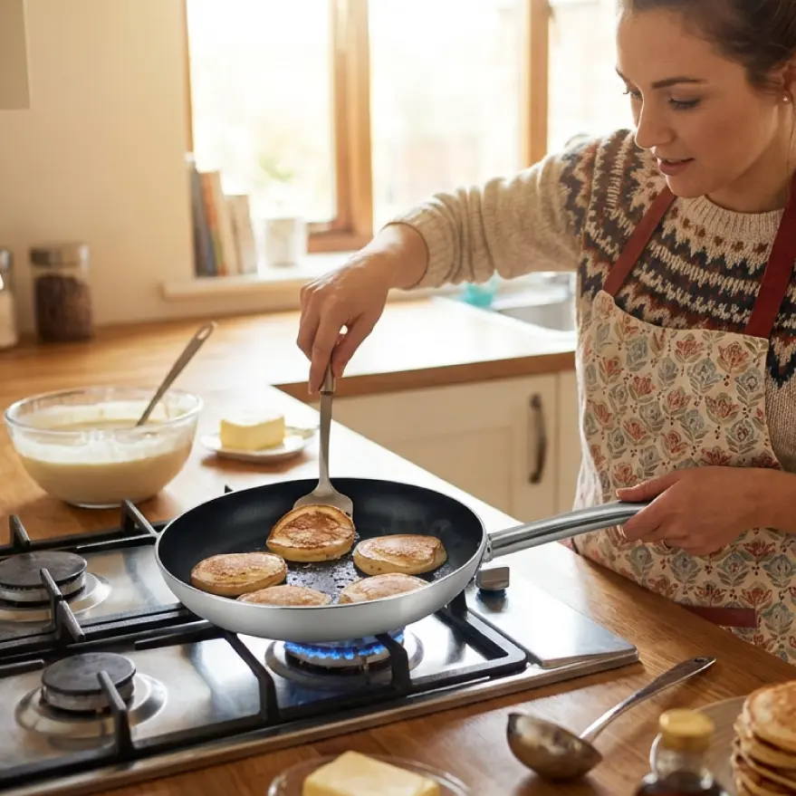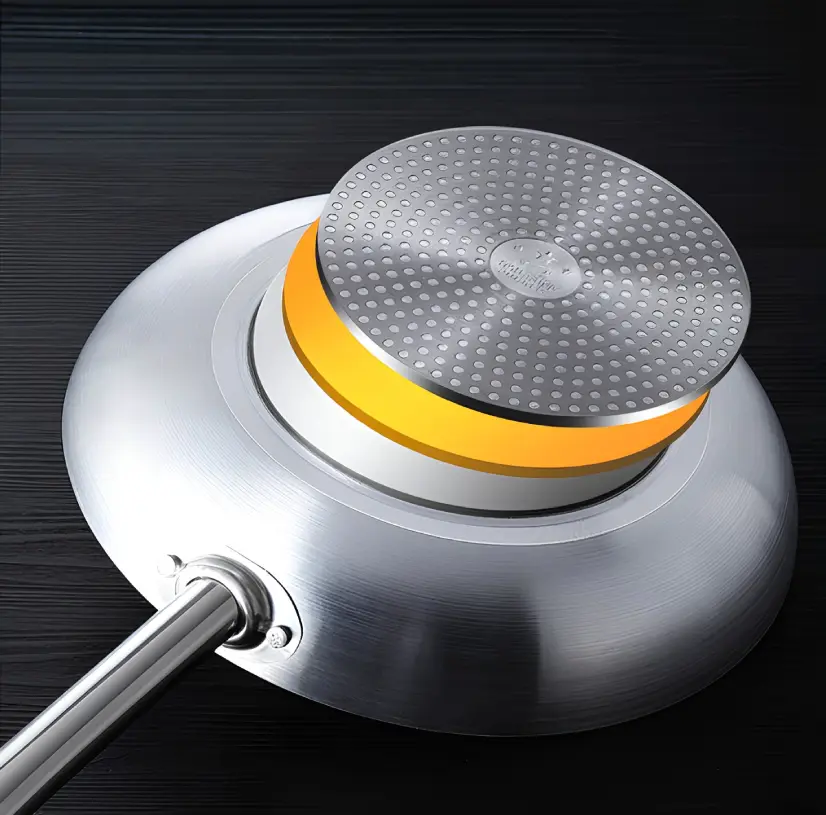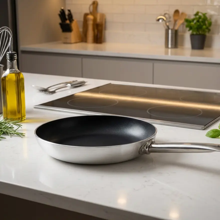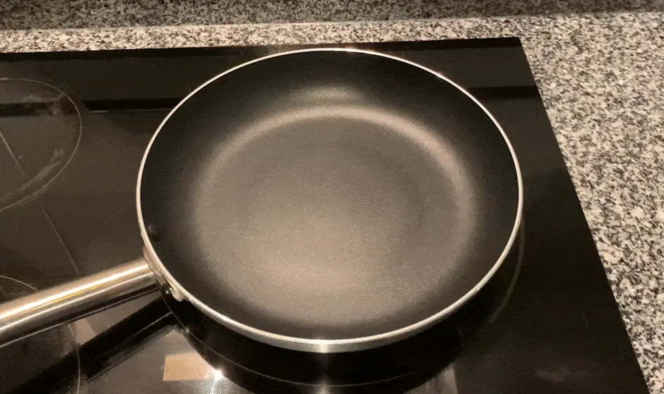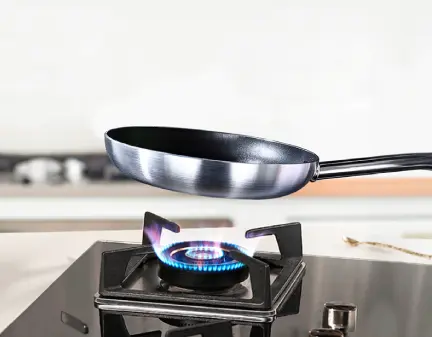 The frying pan has a non-stick coating made with PEEK, a safe material free from PFOA, cadmium, and lead, ensuring that food doesn't stick to the surface.